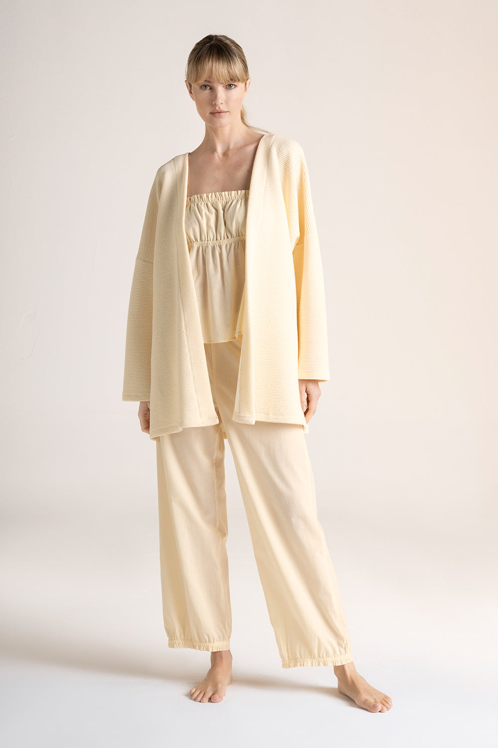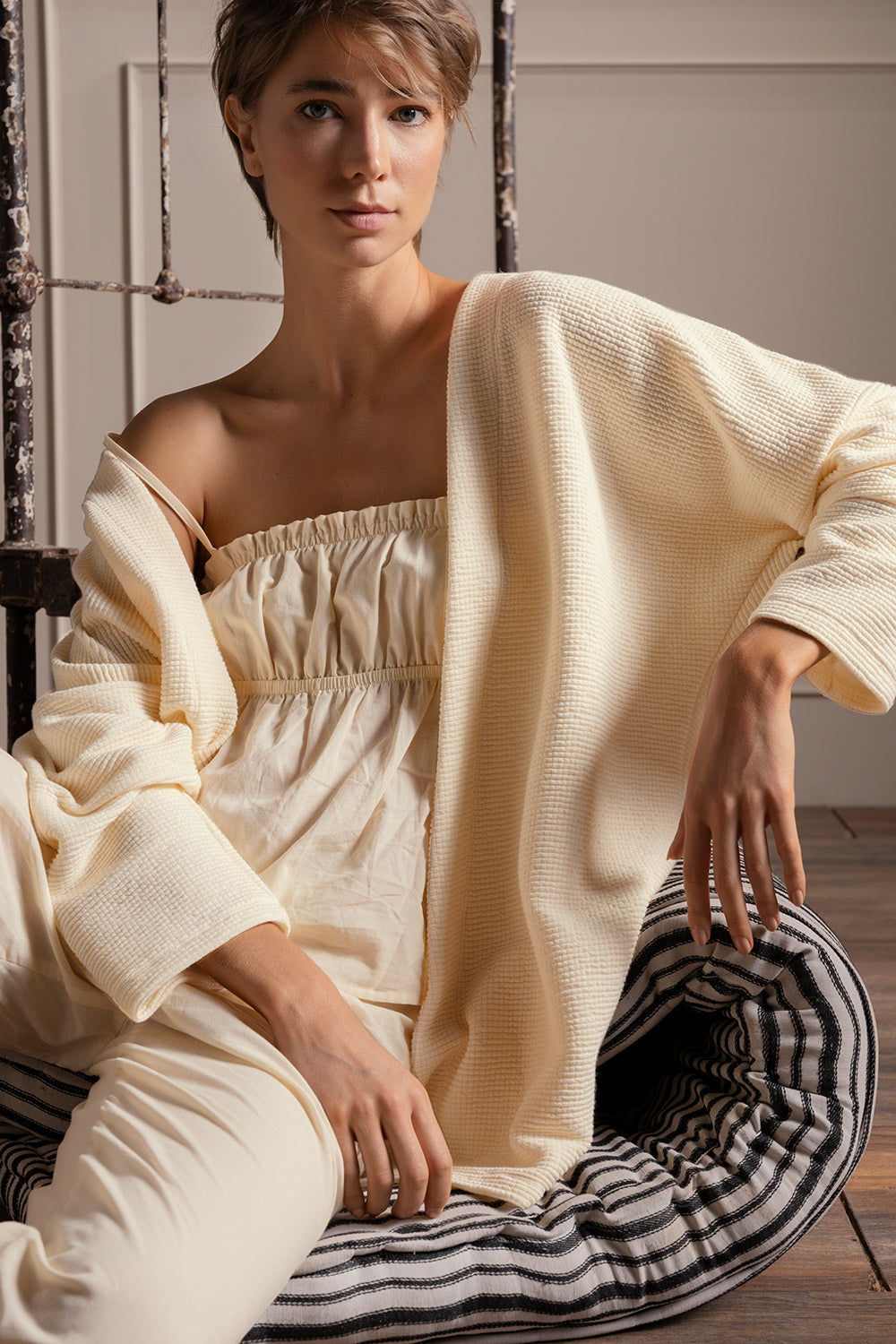 Buzo abierto elaborado en punto suave texturizado, hombro rodado. Color marfil, Ref. 2926M61