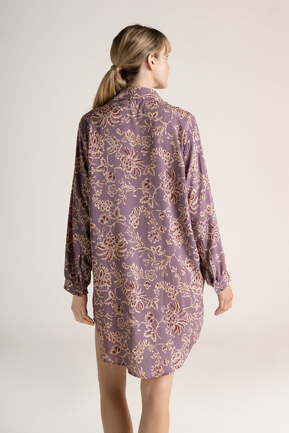 Camisón elaborado en viscosa con estampado floral, cuello con puntas redondeadas y perilla de botones, manga larga con bolero en puño. Color morado/estampado, Ref. 2507061