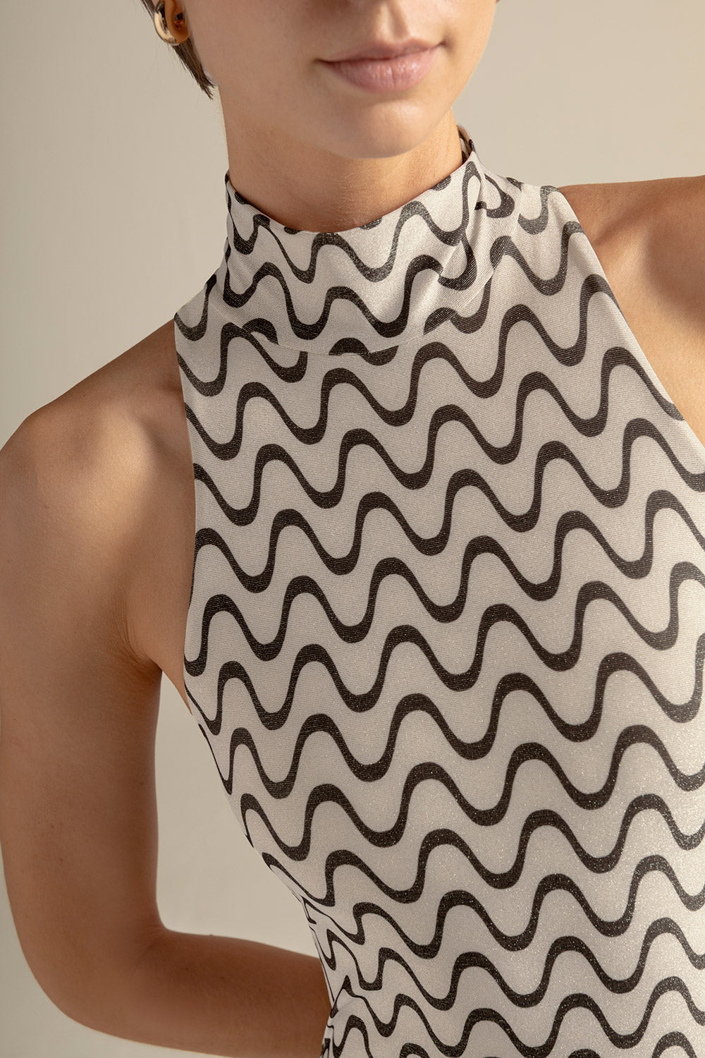 Entero deportivo clásico estampado en color beige y negro con lurex; cierre en espalda dorado; copas removibles; y tela con protección UV. Color estampado negro/beige/ lurex dorado, Ref. 0E64061