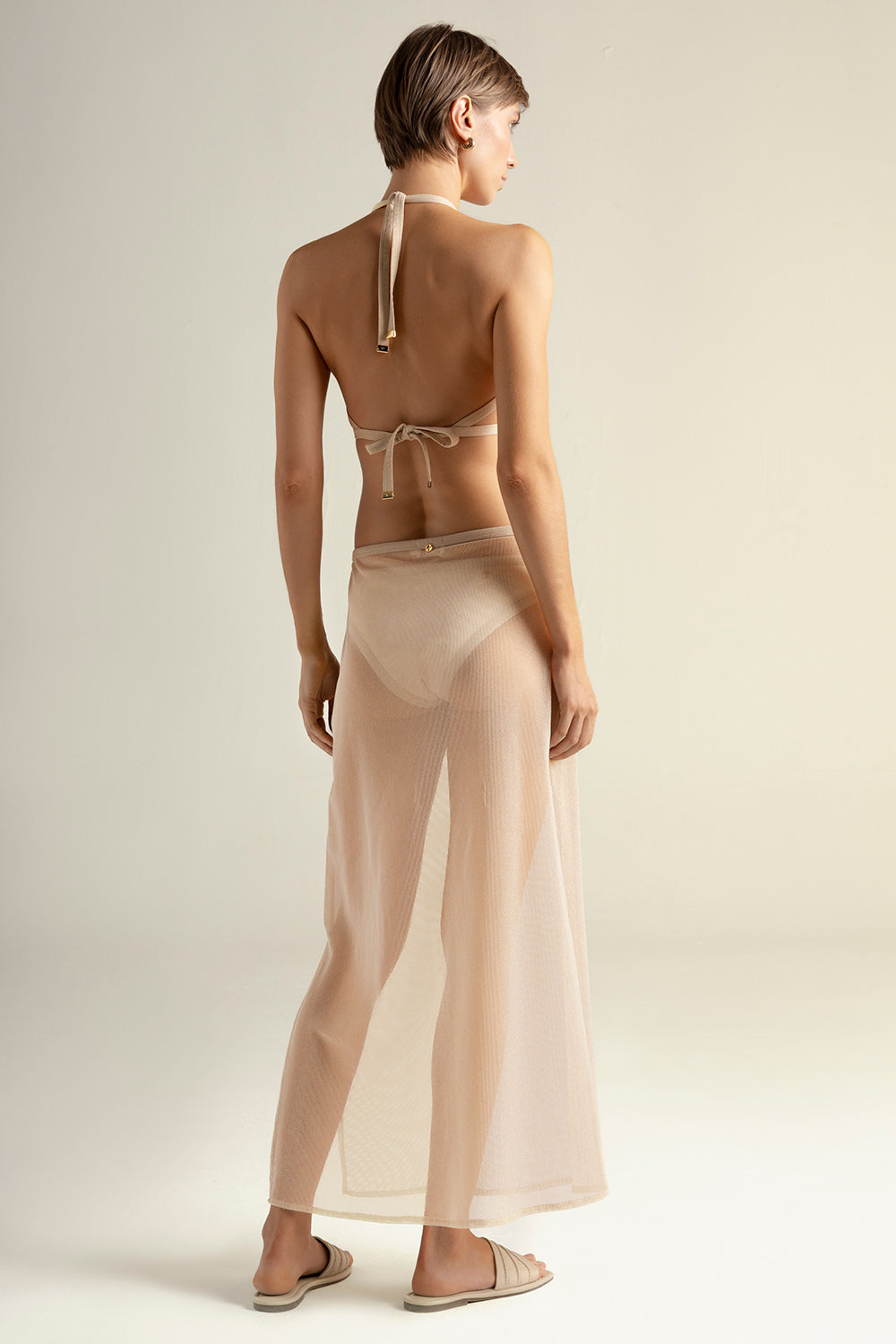 Falda larga en malla, color beige, con lurex dorado y cintura en sesgo con contraste en lurex; y detalle moneda con la “T” grabada en baño de oro, característico de nuestra marca. Color beige/lurex dorado, Ref. 0F26B61