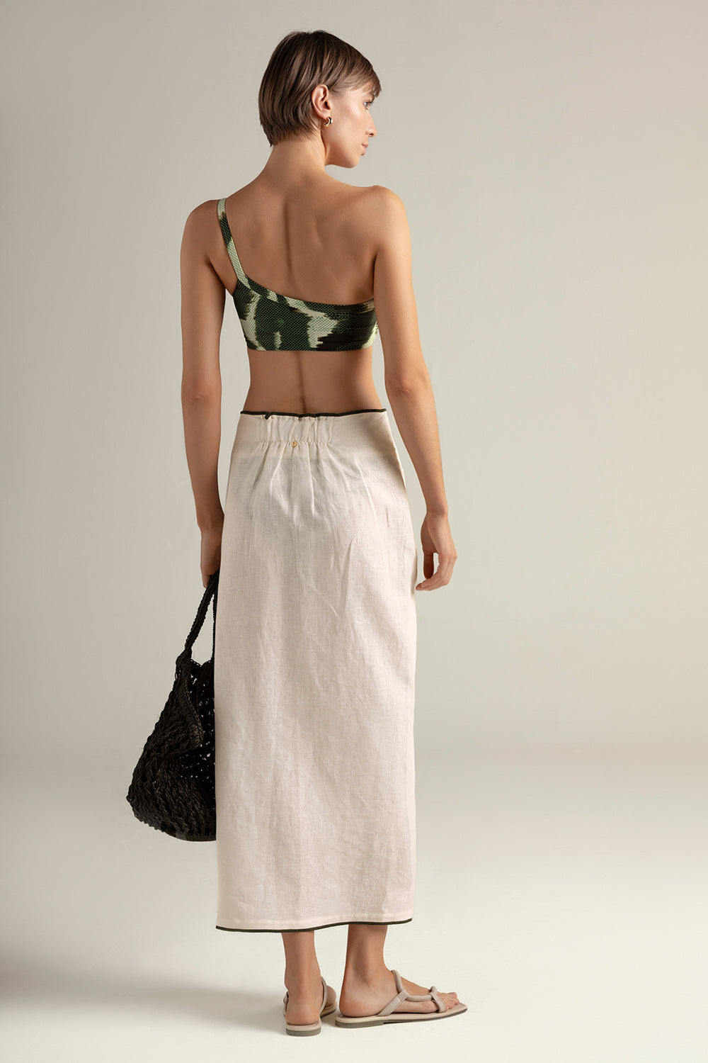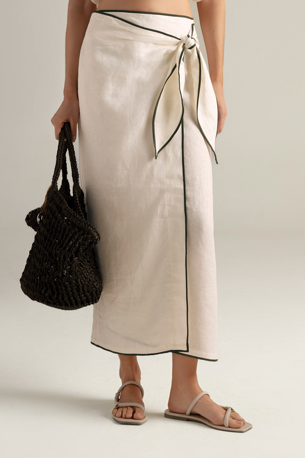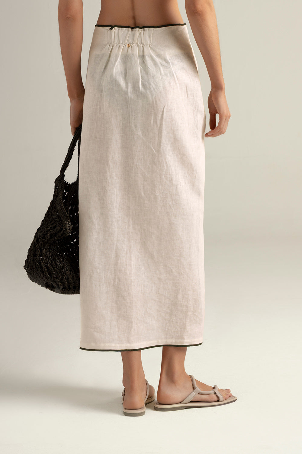 Falda pareo larga en lino 100 % color crema; con costuras filete expuestas en color verde; cruzado en frente con botones internos y tiras laterales para un mejor ajuste y un fit personalizado. Largo midi; detalle moneda con la "T" grabada en baño de oro, característico de nuestra marca. . Color crema, Ref. 0F39C61