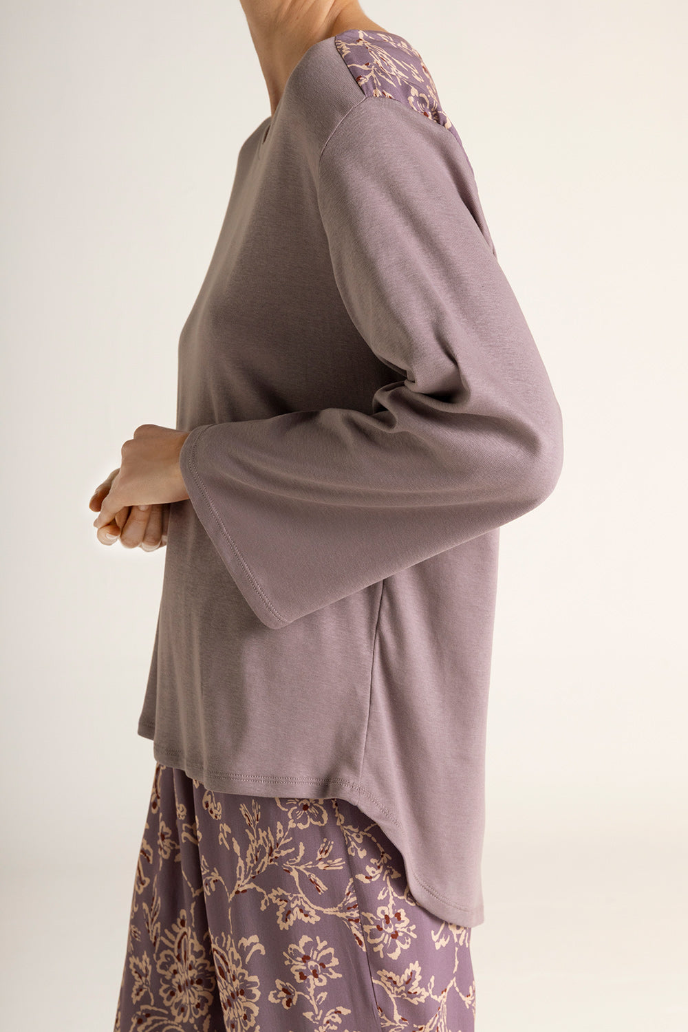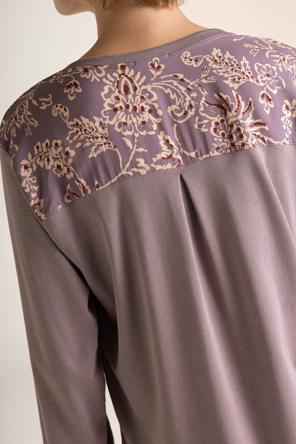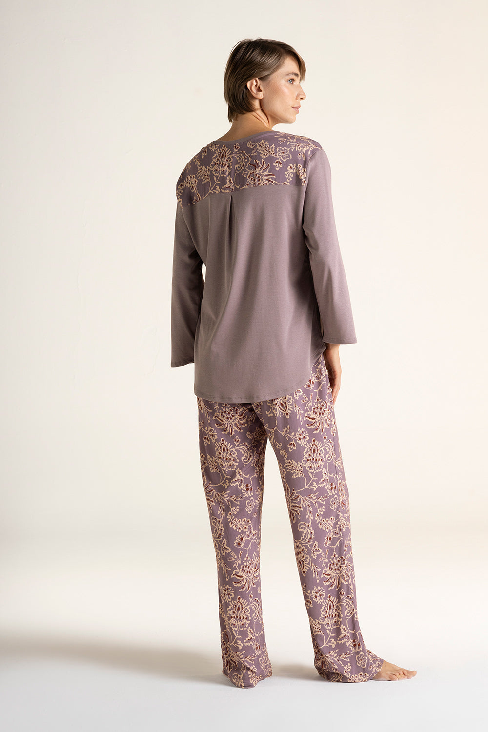 Pijama pantalón con camiseta manga larga en rib de algodón fondo entero, almilla posterior estampada, pantalón clásico bota recta en viscosa con estampado floral. Color morado/estampado, Ref. 2505061