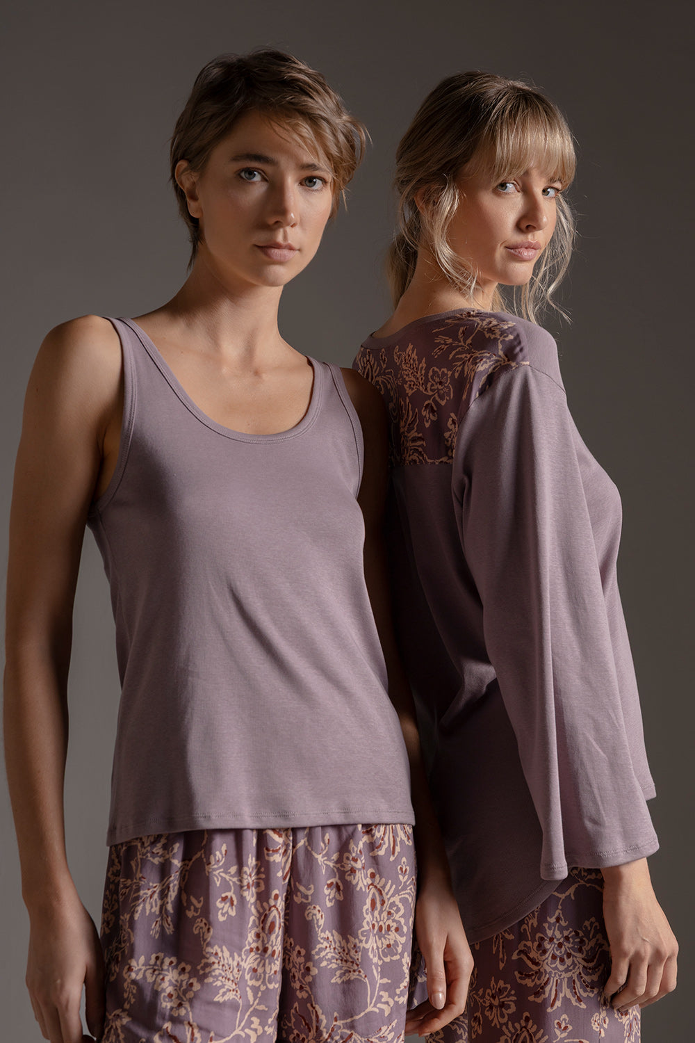 Pijama short con esqueleto en rib de algodón fondo entero, short clásico en viscosa con estampado floral. Color morado/estampado, Ref. 2506061