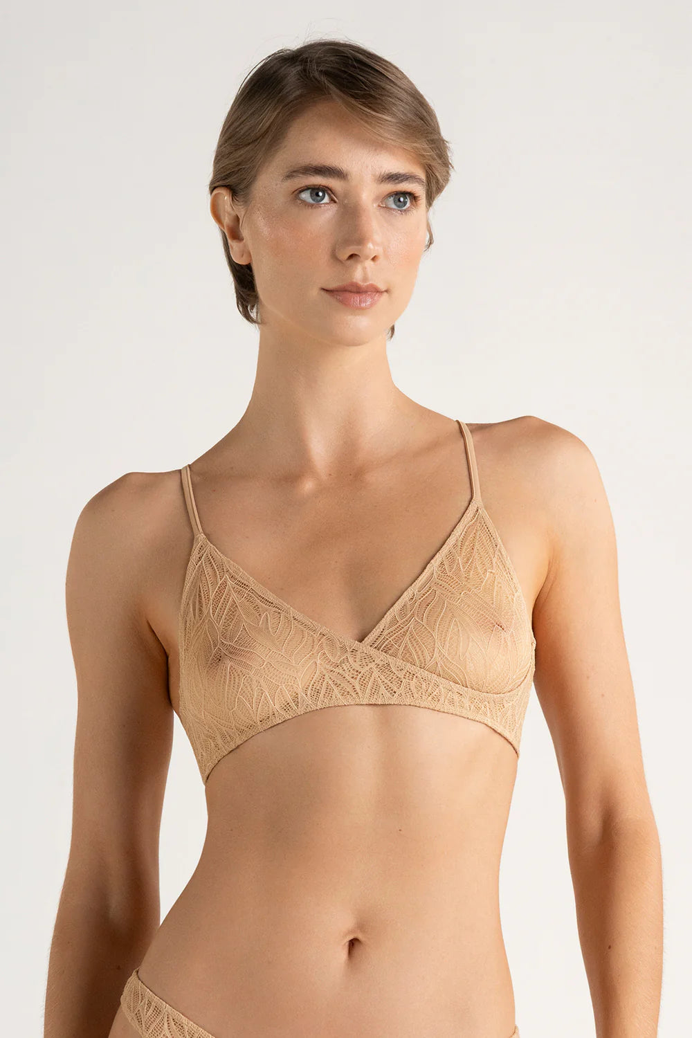 Sostén triangular sin copa de espuma ni aro, elaborado en encaje semitransparente, cargaderas ajustables y abrochadura en espalda. Color piel, Ref. 2417P61