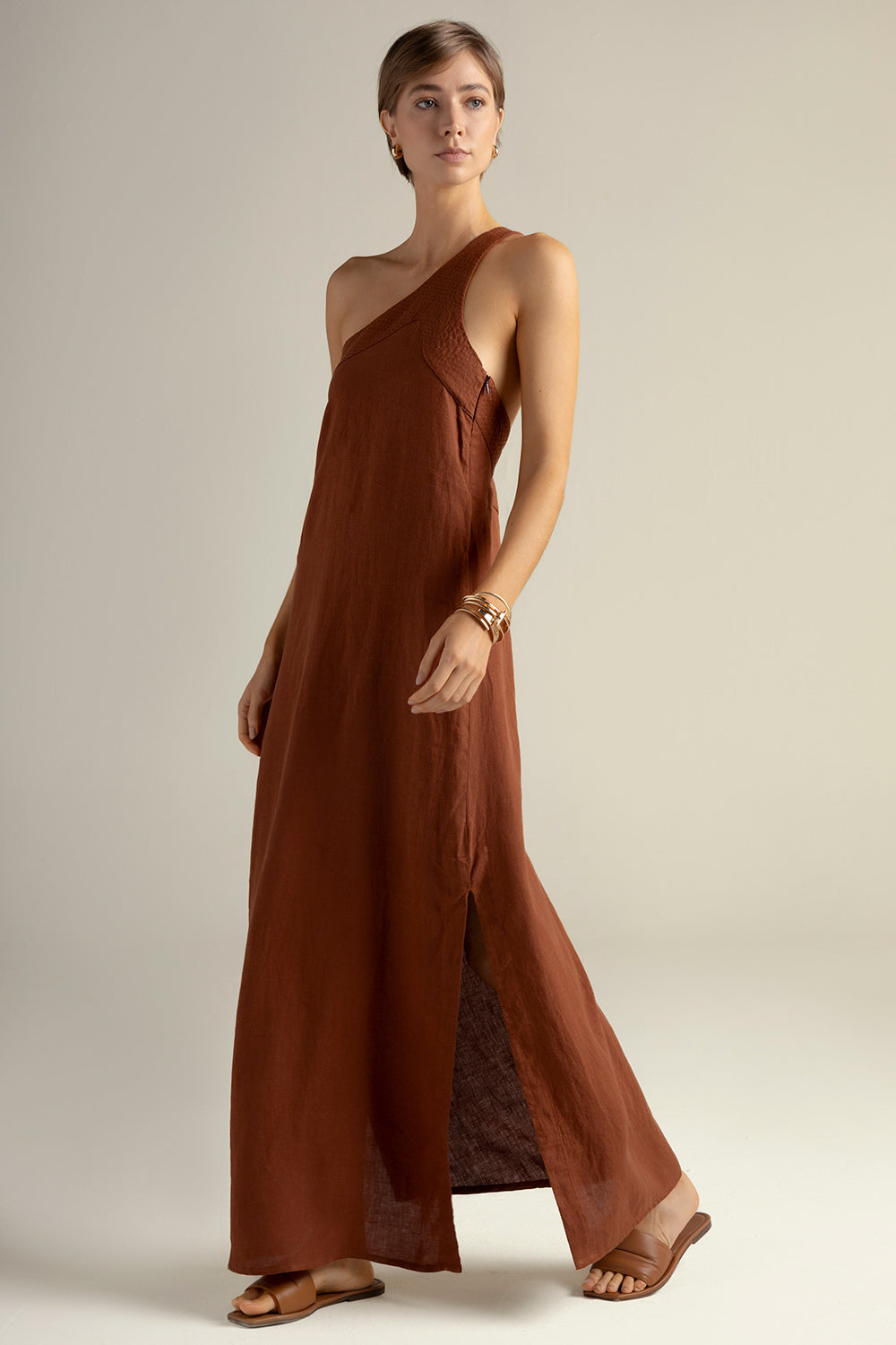Vestido largo de un solo hombro en lino 100%, color terracota; detalle de costuras tono a tono en el escote; silueta amplia; aberturas en los costados; cierre invisible en lateral; y detalle moneda con la “T” grabada en baño de oro, característico de nuestra marca. . Color terracota, Ref. 0F32T61
