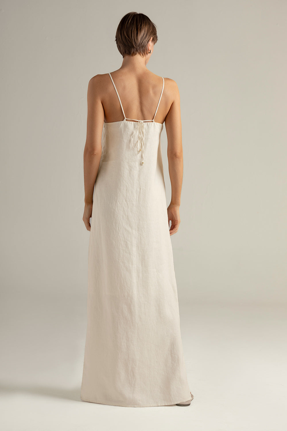 Vestido largo en lino 100% color crema, con escote recto y tiras finas ajustables para un fit personalizado; cierre invisible lateral; abertura en costados; forro interno; y punteras en baño de oro, característico de nuestra marca para evitar oxidación. Color crema, Ref. FI14C61