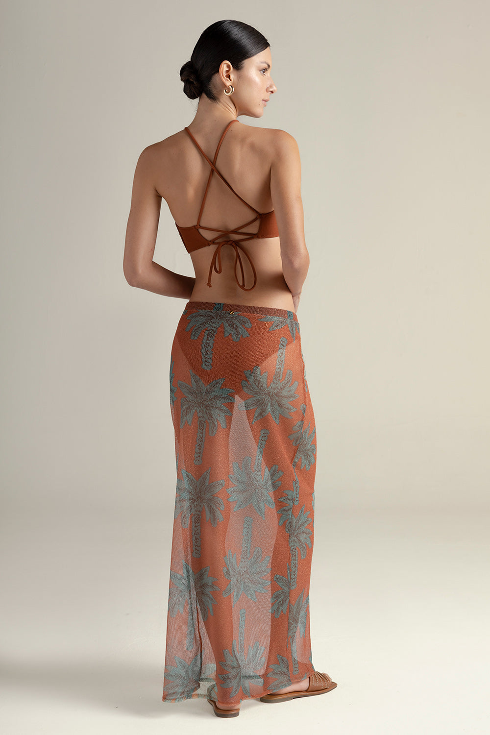 Falda larga en malla con lurex dorado, estampado de palmeras terracota y azul; cintura con elástico para un mejor fit; y detalle moneda con la “T” grabada en baño de oro, característico de nuestra marca. . Color estampado terracota/azul/ lurex dorado, Ref. 0F18061