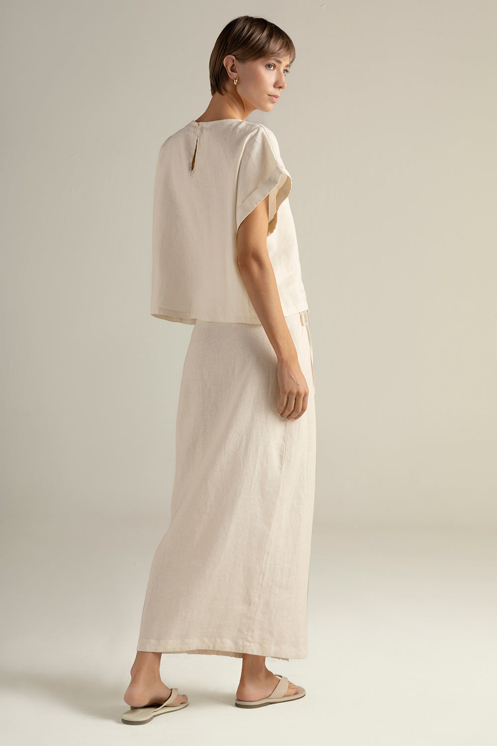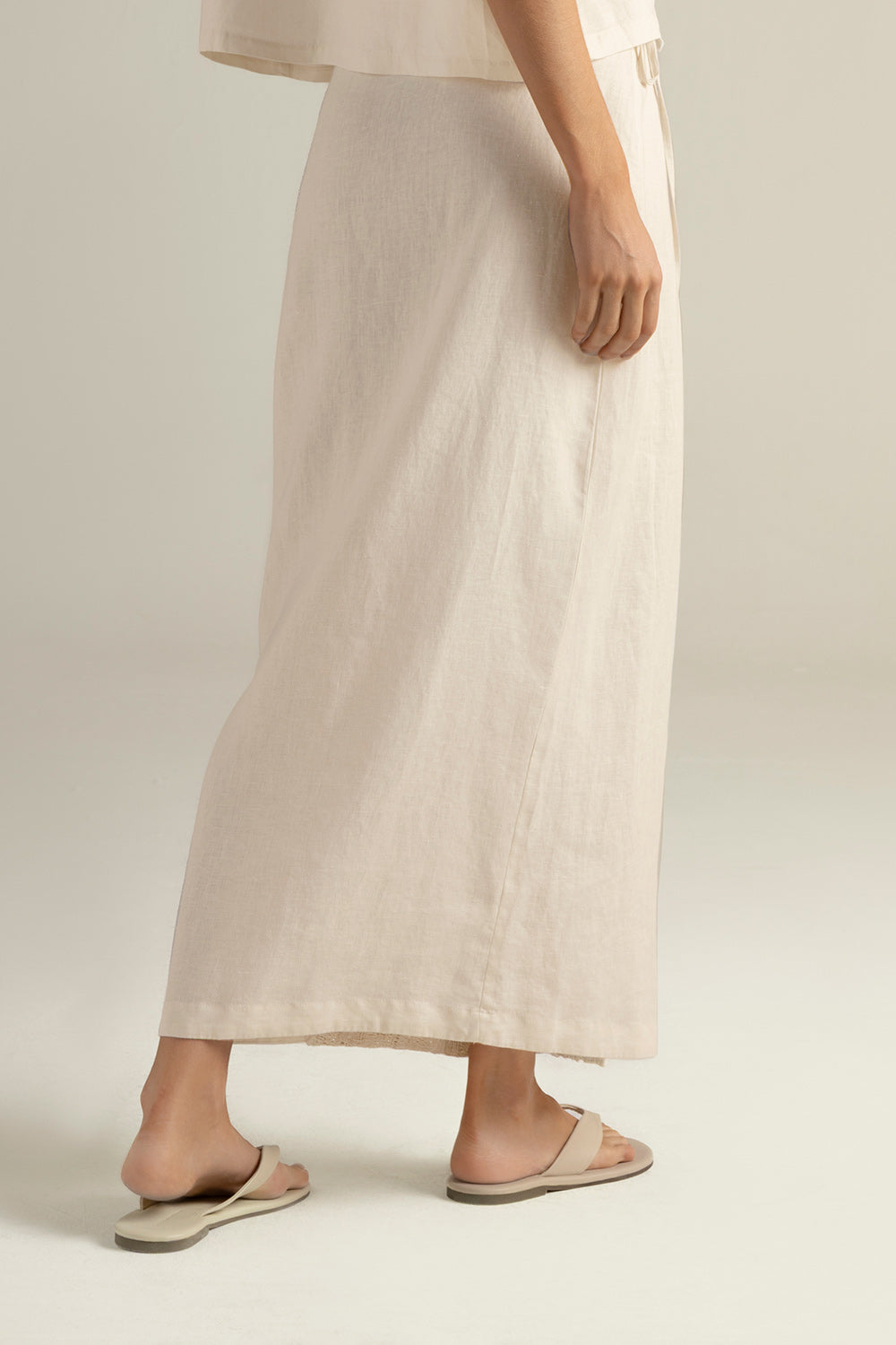 Falda pareo larga con tapa delantera en tejido de algodón color crema y tapa posterior en lino 100% color crema; largo midi; cruzada en frente con botones internos y tiras laterales para un mejor ajuste y un fit personalizado; punteras en baño de oro, característico de nuestra marca para evitar oxidación. Color crema, Ref. FI11C61