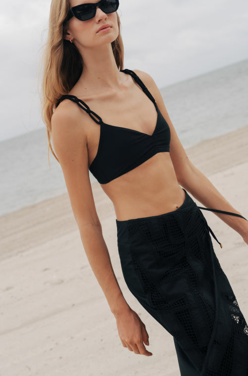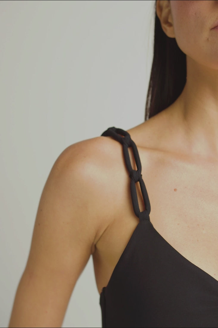 Top bikini deportivo con tiras en cadeneta, copa removible. Color Negro, Ref. 0B75051