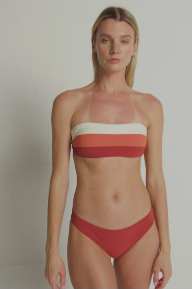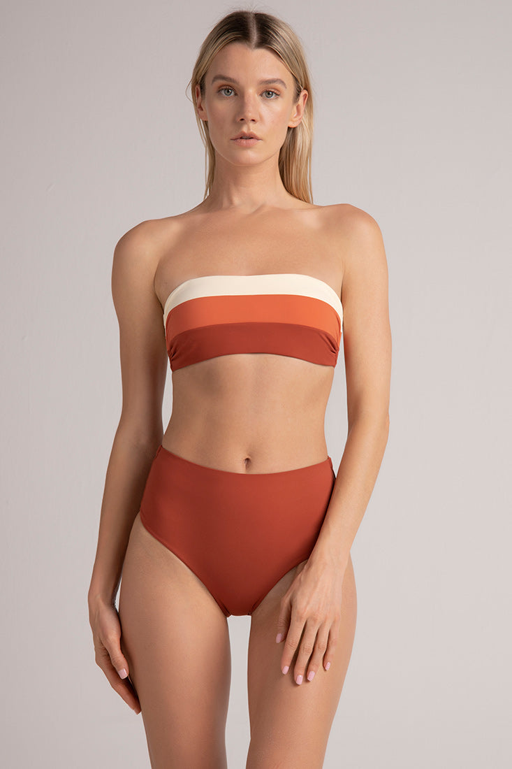Top bikini strapless en bloques de color con sesgo y tiras en contraste con punteras doradas removibles en centro, copa removible. Color Terracota Oscuro/Marfil/Terracota Claro, Ref. 0B73051