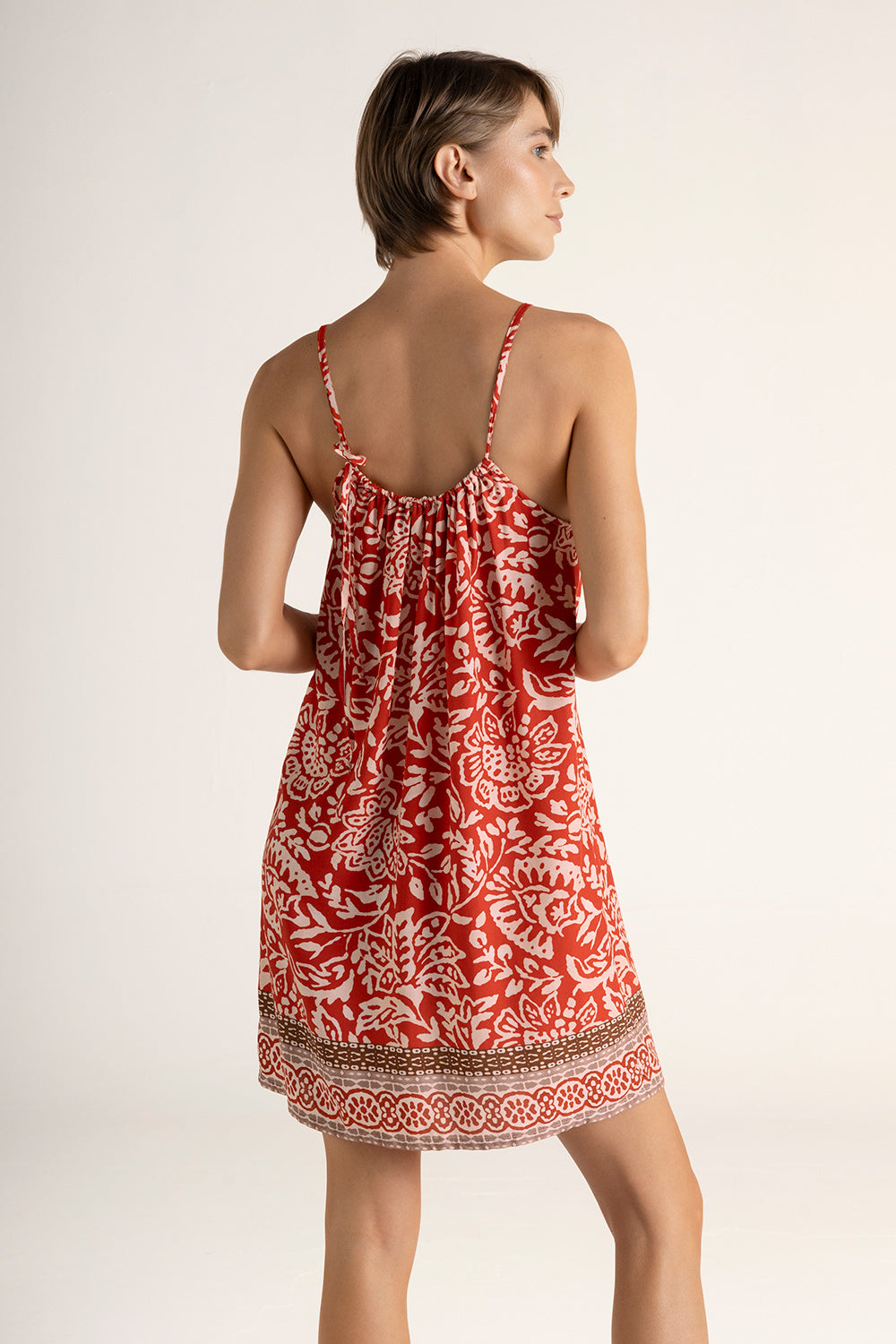 Batola elaborada en viscosa con estampado cenefa, escote redondo ajustable con top interno para mayor soporte y comodidad, cargaderas ajustables que se anudan en la espalda. Color estampado, Ref. 2517061
