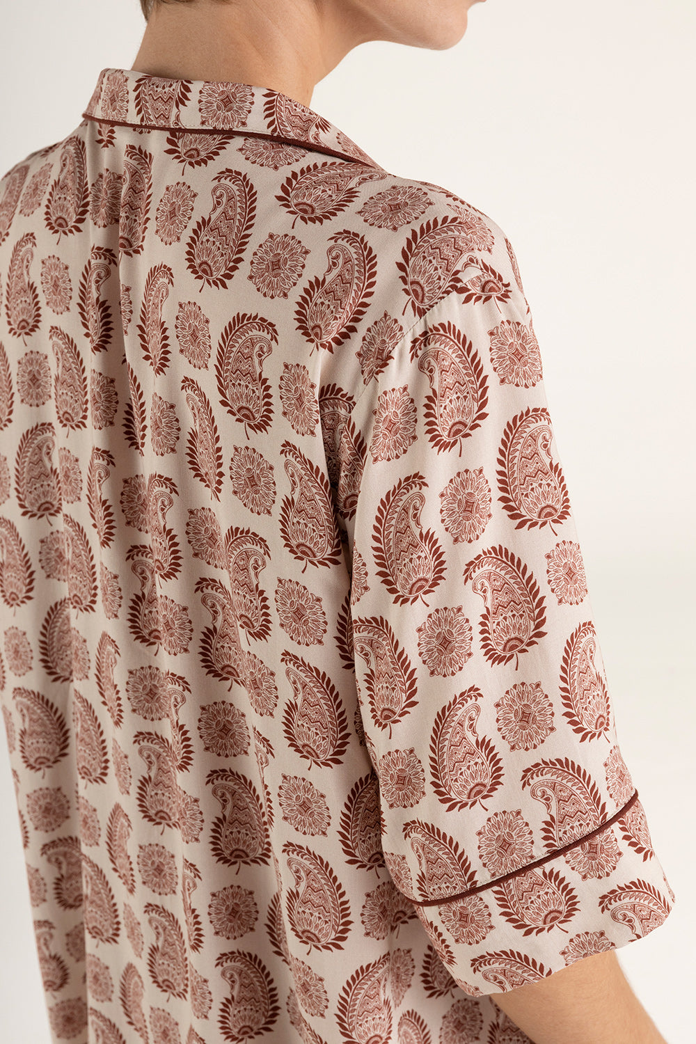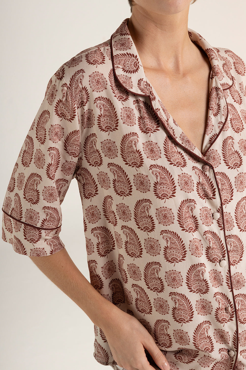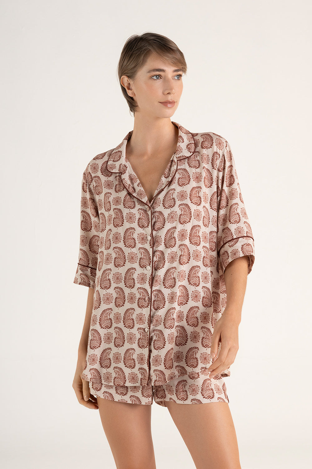 Pijama short elaborada en viscosa con estampado de arabescos, camisa manga corta, con cuello resort y perilla de botones con vivos en contraste, shorts clásicos de bota recta. Color estampado, Ref. 2541061