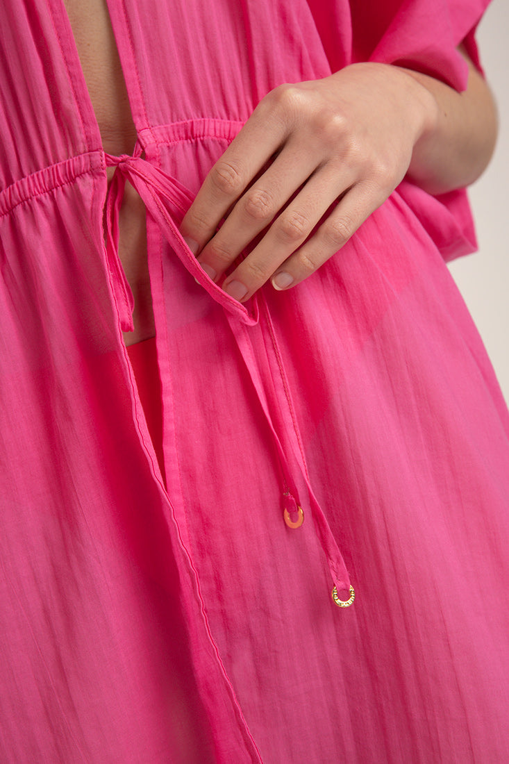 Cover up corto abierto con tiras ajustables y argollas doradas. Color fucsia, Ref. 0A37F43