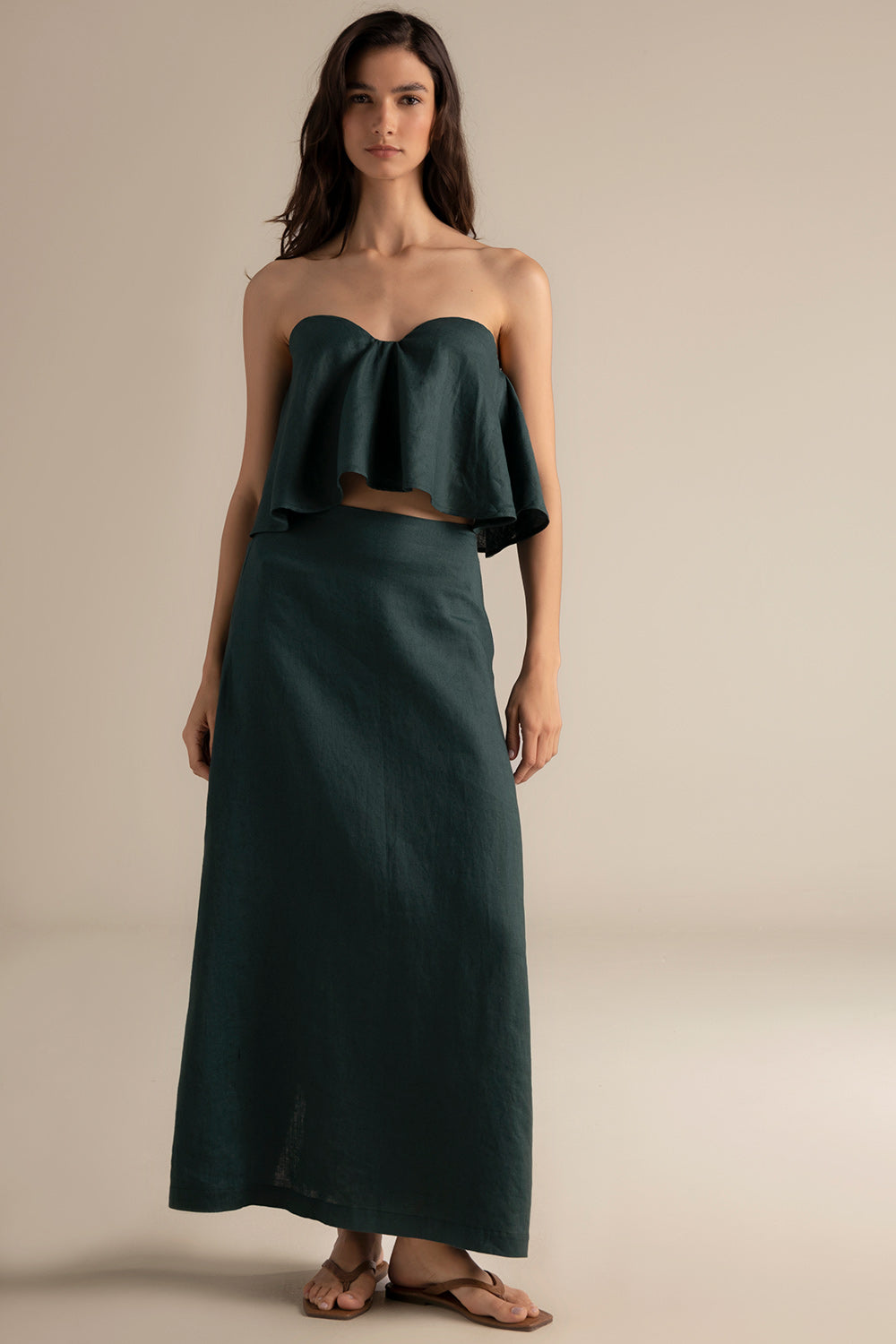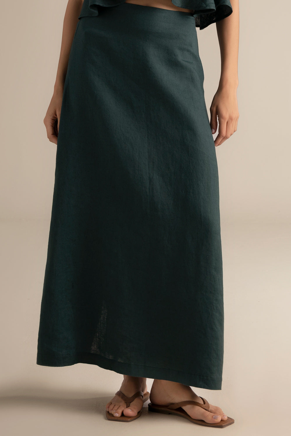 Falda larga recta 100% lino color verde. cierre invisible en costado y abertura en la parte posterior, detalle moneda con la "t" grabada en baño de oro característica de nuestra marca para evitar oxidación . Color verde, Ref. 0F83052