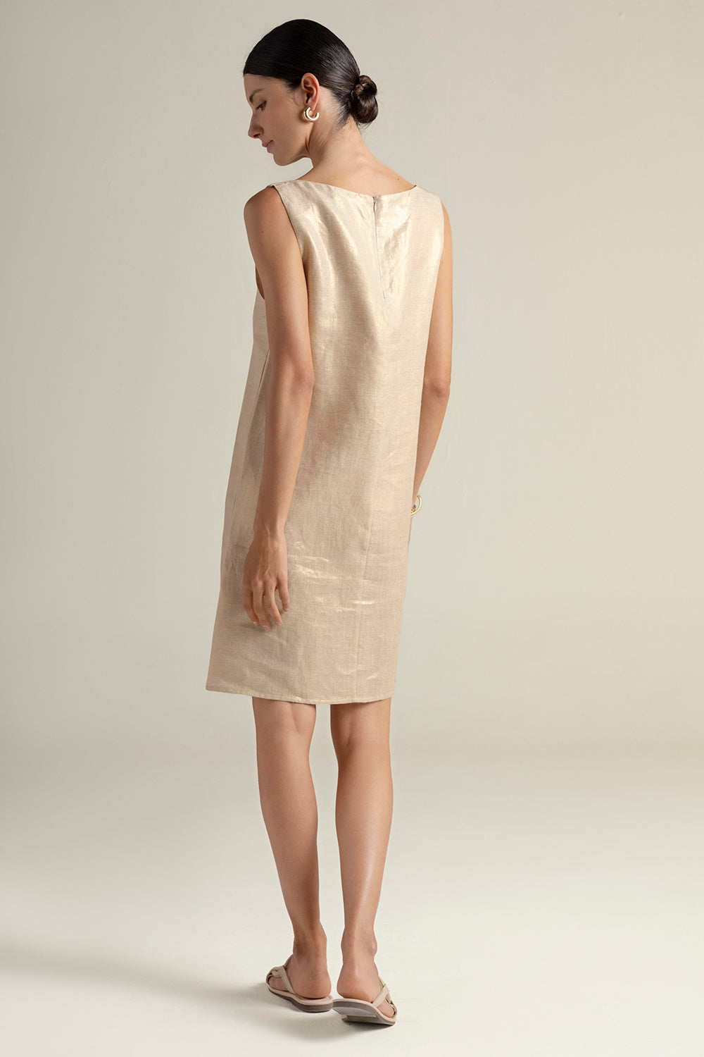 Vestido corto en lino 100% con brillo dorado; con cuello redondo y manga sisa; forro interno; y cierre invisible en la espalda. Color dorado, Ref. 0F16C61