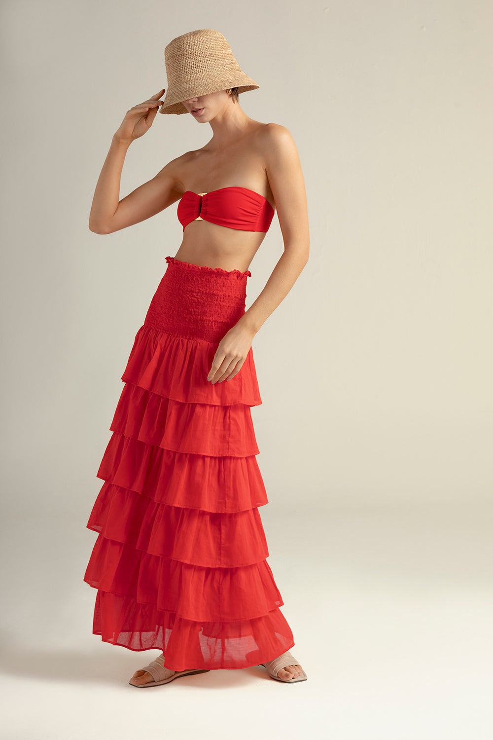 Vestido / falda larga en algodón 100%, color rojo; cintura en nido de abeja y capas de boleros, también se puede usar como vestido; y detalle moneda con la “T” grabada en baño de oro, característico de nuestra marca. . Color rojo, Ref. 0F31R61