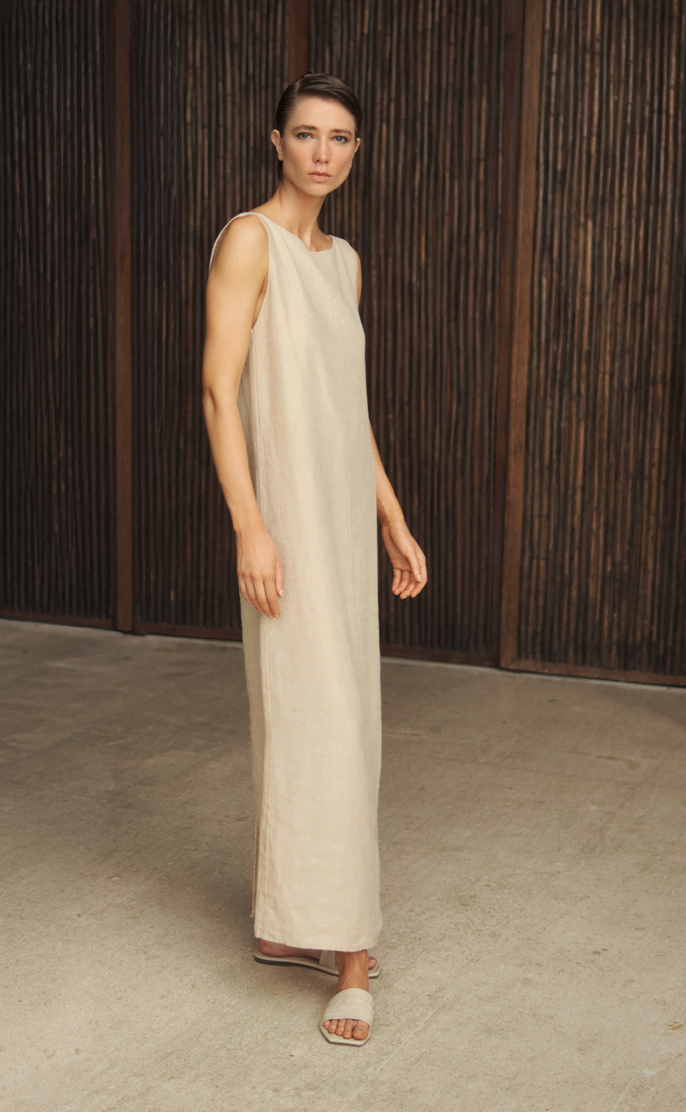 Vestido largo en lino 100% con brillo dorado; con cuello redondo y manga sisa; forro interno; y cierre invisible en la espalda. Color dorado, Ref. 0F15C61