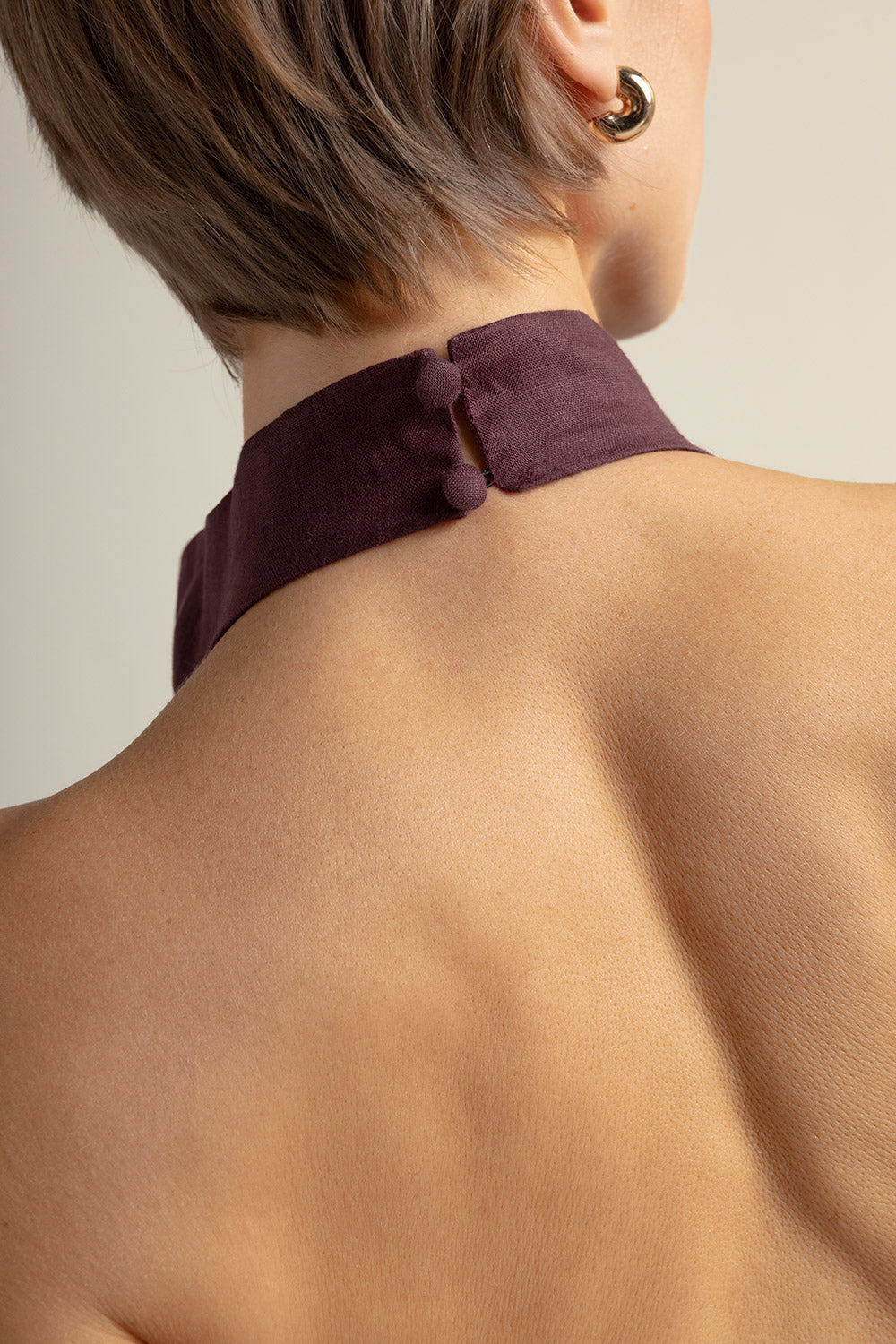 Vestido largo en lino 100%, color vino; con cuello halter drapeado y escote profundo en la espalda; cierre posterior con botones; y detalle moneda con la “T” grabada en baño de oro, característico de nuestra marca. Color vino, Ref. 0F24V61
